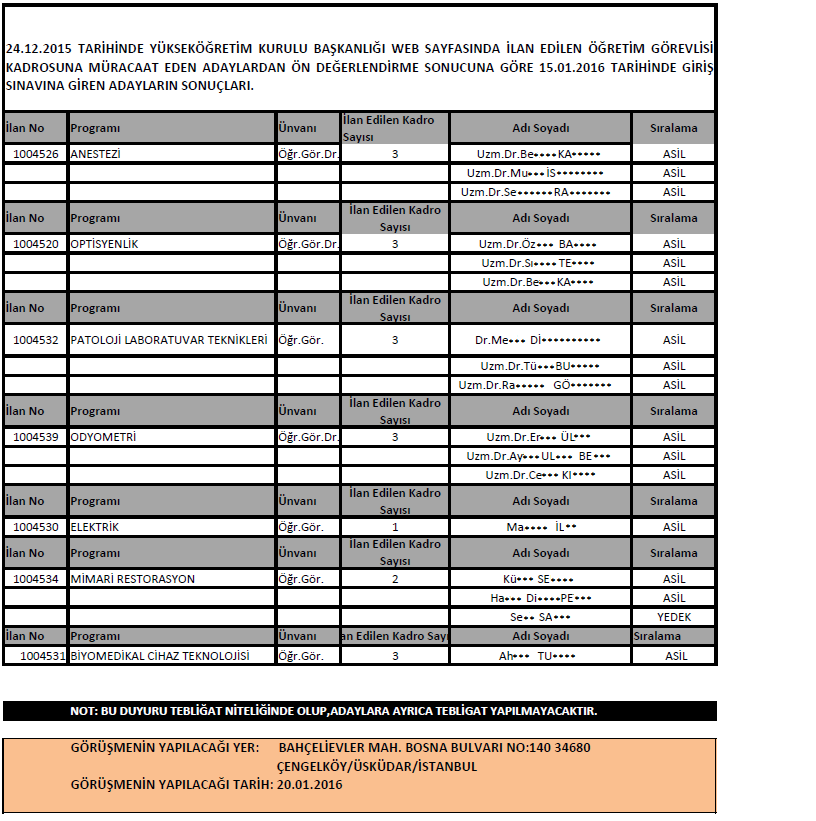 24.12.2015 Tarihli Öğretim Elemanı Alım İlanı Sınav Sonuçları Hk.